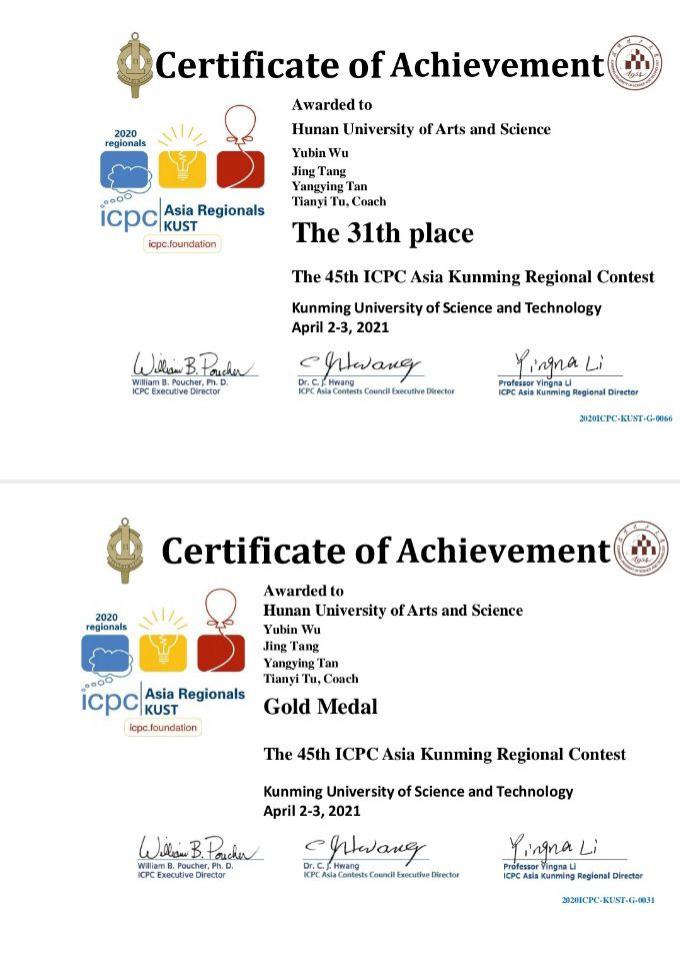 日前,第 45 届国际大学生程序设计竞赛(ICPC)亚洲区域赛在昆明举行。湖南文理学院计算机与电气工程学院屠添翼老师指导,唐京、吴宇斌、谭杨盈三位软件工程专业学生组成的 " 两级反转 " 代表队喜获金奖。