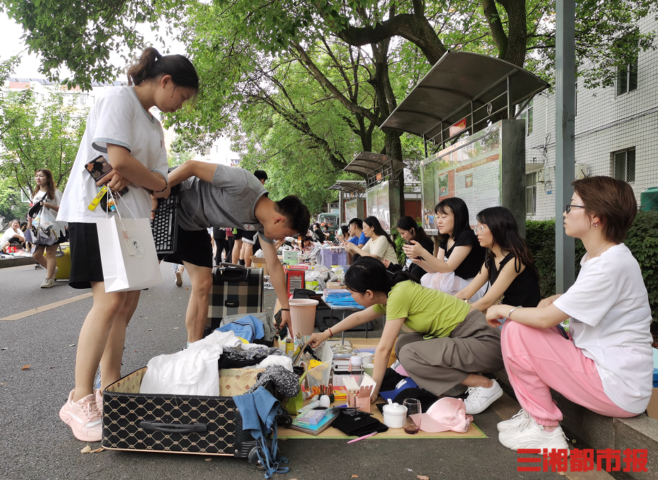 18时许,在湖南文理学院第六学生宿舍门口,现场人头攒动,毕业生们拉着行李箱,拿着小夜灯,铺上小席子,摆上各类闲置物品。大到吉他等乐器,小到钥匙环,各类闲置物品应有尽有,价格几元至上百不等,现场叫卖声、讨价还价声不绝于耳。前来购买的不只是该校低年级学生,“跳蚤市场”还吸引了周围的居民赶来“淘宝”。