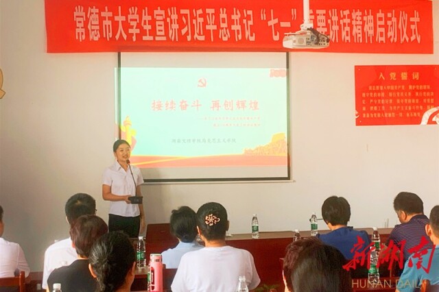 湖南日报·新湖南客户端7月12日讯(记者 李杰)重温中国共产党的光辉历史,厚植爱国情怀,激发奋斗热忱。7月12日,常德市大学生宣讲习近平总书记“七一”重要讲话精神启动仪式在武陵区新建社区举行。启动仪式后,来自湖南文理学院党的创新理论大学生宣讲团的11名大学生,以《接续奋斗 再创辉煌》为题,为社区近百名老党员、社区工作者、居民作了精彩宣讲。