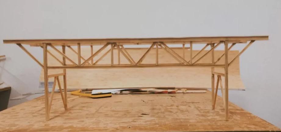 据介绍,对于 " 神奇桥梁 " 的构思与设计,设计团队前期采用了悬索结构形式,结构是比较稳固的,不过重量太高,承受极限荷载没有表现出很好的承载能力。团队成员经过多次试验发现,使用三角形结构制作模型的基础上对模型进行优化设计,主要将三角形结构简化为桁架结构或桁梁混合结构。简单的梁加上桁架结构并辅以桥面能够很好地解决这个问题,通过多次调整实验,结合数据分析,可以实现荷重比的最合适状态,能顺利稳定地承受活动荷载并极大地提高极限承载能力。桁架结构不仅减轻了桥梁自重,而且提供的竖向承载能力的效果更优。因此设计团队选用了桁架式结构体系。