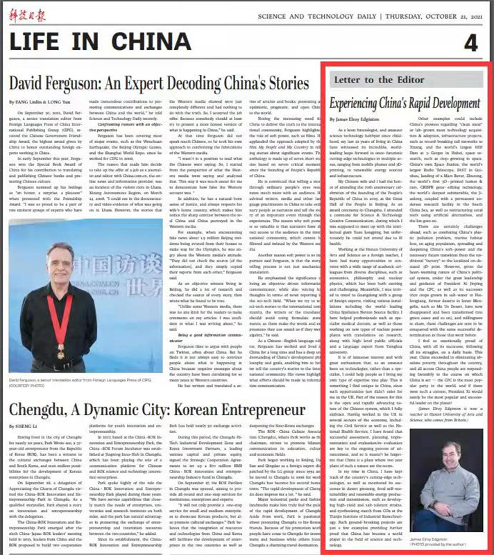 三湘都市报10月26日讯(通讯员 杨妙 王霞 全媒体记者 杨斯涵 黄京) “能够在中国生活是他的骄傲,并坚信在中国共产党的领导下,中国的发展将会越来越好。”近日,《科技日报》(英文版)第4版刊登了湖南文理学院英国籍外教詹姆斯·艾瑞·艾金顿的署名文章《经历中国的快速发展》(Experiencing China’s Rapid Development)。在文中,詹姆斯以一名来中国湖南文理学院从事外教工作12年的英国人视角,用真情实感讲述了他在中国的幸福生活,对中国近年来在科技、经济、文化、教育等领域取得的飞速发展表达了由衷的赞美之情。