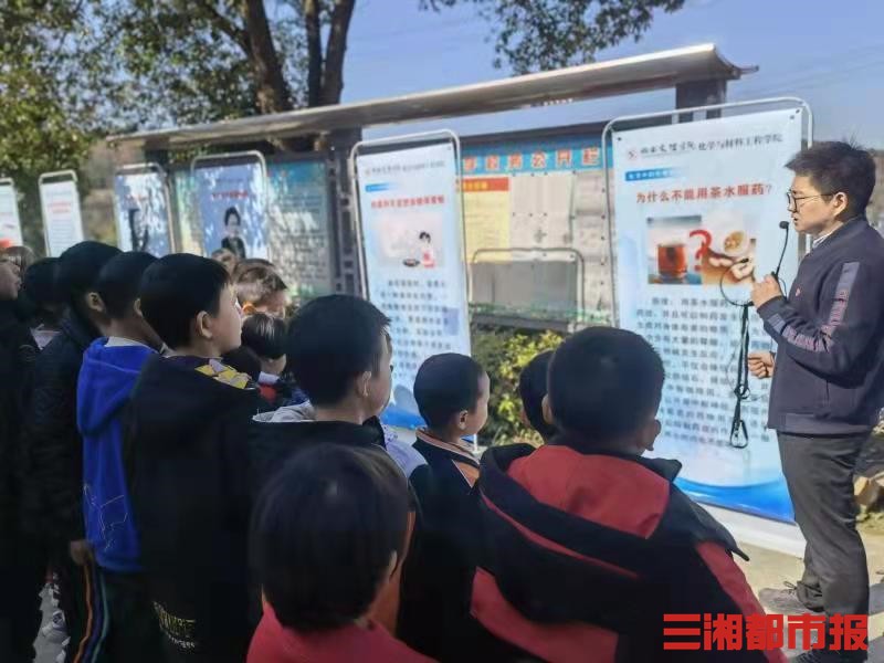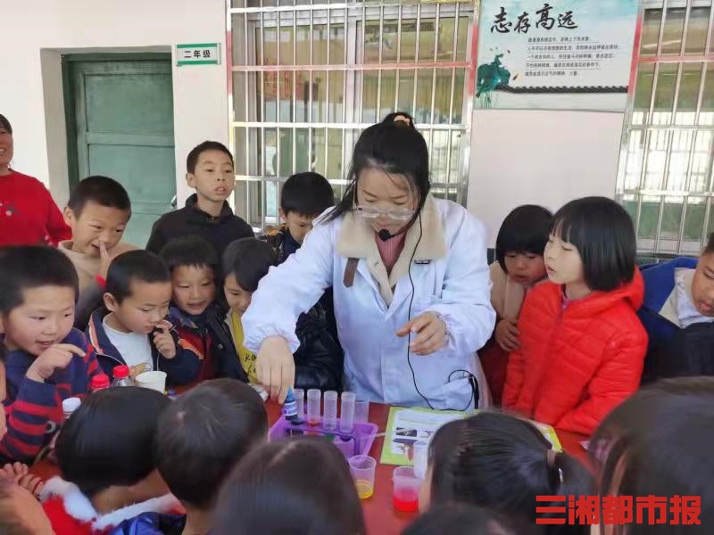 三湘都市报12月2日讯(通讯员 易姣 严杨 全媒体记者 刘镇东 黄京)“同学们,试管中红色和蓝色的药水混在一起,会发生什么样的变化呢?”“那黄色和蓝色呢?”近日,在湖南省石门县茶园湾村小学教学点茅坪小学的操场上,40多名孩子正围在临时搭建的简易实验台前,目不转睛地看着湖南文理学院化材学院彭辉艳老师“变魔术”。