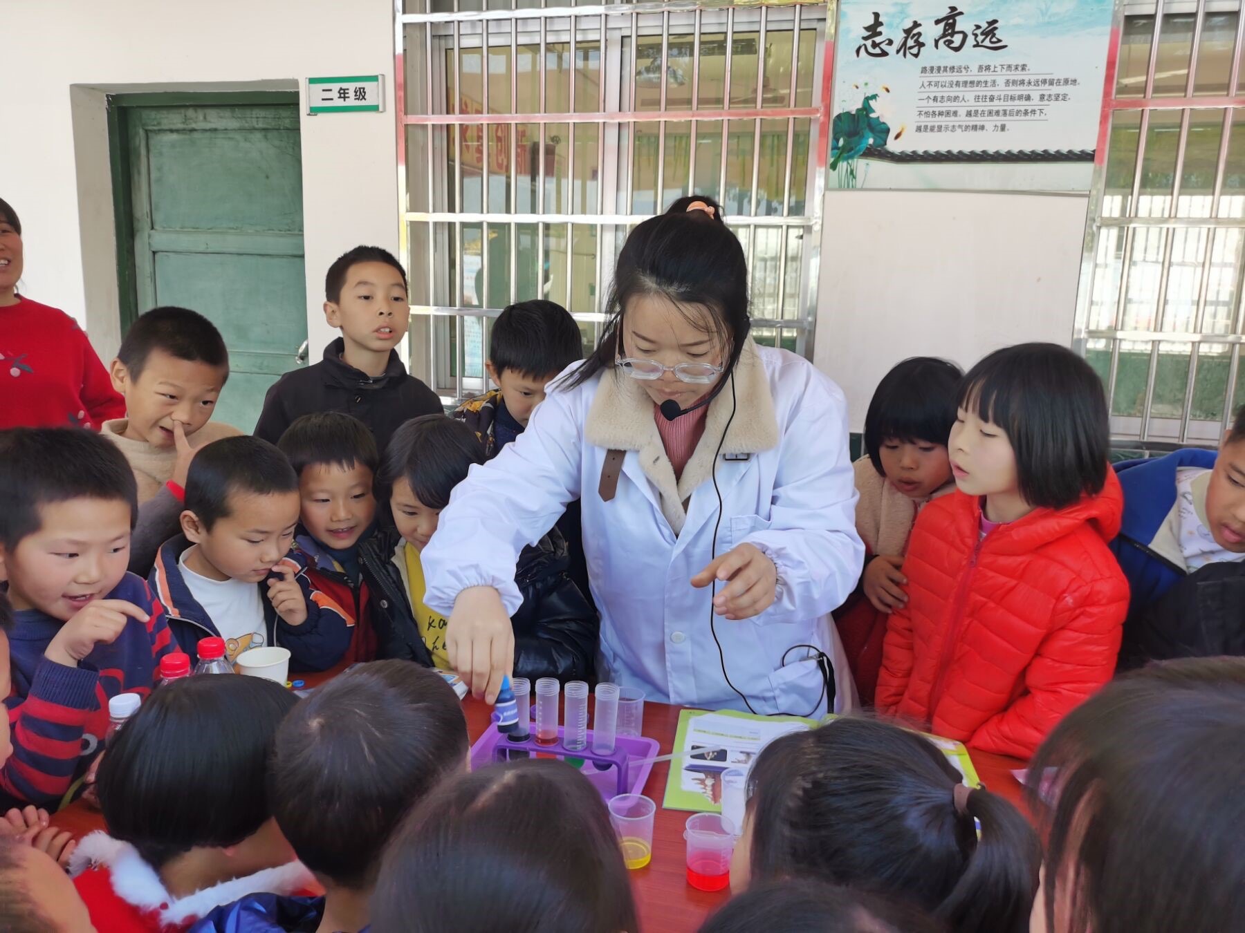 茶园湾村是湖南文理学院的乡村振兴帮扶点。当天,该校化材学院的多名党员教师带着实验药品和器材,来到学校给孩子们上生动有趣的化学科普实验课。彭辉艳身着白色实验服,一边提问,一边操作,于是有了文章开头那一幕。四种颜色的药水经过不断混合,快速地变化出了各种颜色,这一过程让孩子们感到十分新奇,彭辉艳也俨然成了孩子们眼中的魔术师,当“彩色喷泉”最终呈现在孩子们眼前时,现场爆发出一片惊叹声。实验尾声,彭辉艳告诉孩子们:“只要同学们认真学习、勤于思考、勇于实践,自然界中的五颜六色,都可以用我们的双手去创造。”
