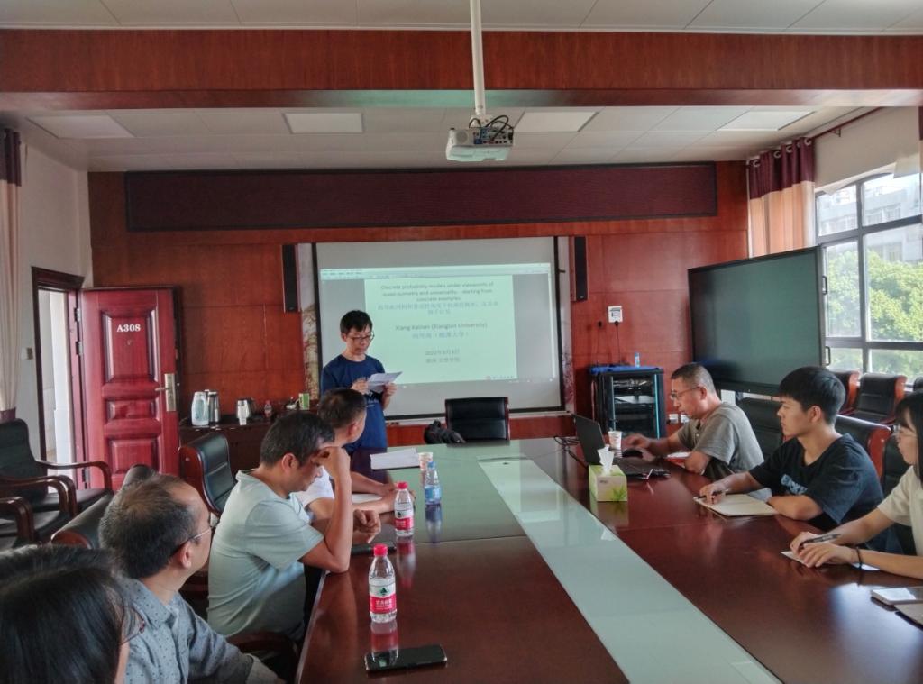向教授报告的题目是“拟等距同构和普适性角度下的离散概率”,他结合近年来团队的重要成果:证明非初等双曲群上分枝随机游走的体积增长和边界的Hausdorff维数的临界指数为1/2的普适性(在S. Lalley ICM2006邀请报告中的一个相关猜想上取得了突破)等,阐述了离散概率模型的普适性和刚性,并和师生在随机过程和随机分析方面开展了热烈的讨论。