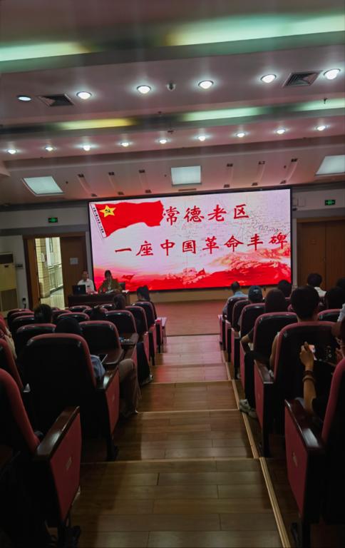 刘春林从“中国共产党在常德的组织建设”“中国共产党在常德领导的军事斗争”“中国共产党在常德领导的工农运动”“中国共产党在常德领导的人民政权”以及“常德对中国革命的贡献”等五个方面讲述了常德本土红色革命文化资源。在讲座中,刘春林引用了大量新中国成立初期的历史事件,图文并茂地讲述了发生在常德这块红色沃土上的那些鲜为人知的人民英雄人物和他们的故事。在武陵大地上,走出了“中国工运先锋”黄爱,“农运先驱”刘泽远等一大批光照千秋的革命英雄;这里诞生过湘西北第一个马克思主义研究会、第一个社会主义青年团以及常德地方执委、中共湘西特委等革命组织,播种了一大批革命的火种。刘春林如数家珍般饱含深情的讲解,生动地再现了常德老区无数先烈的战斗故事、英雄事迹和革命精神,也深深感动了在场的每一位师生。