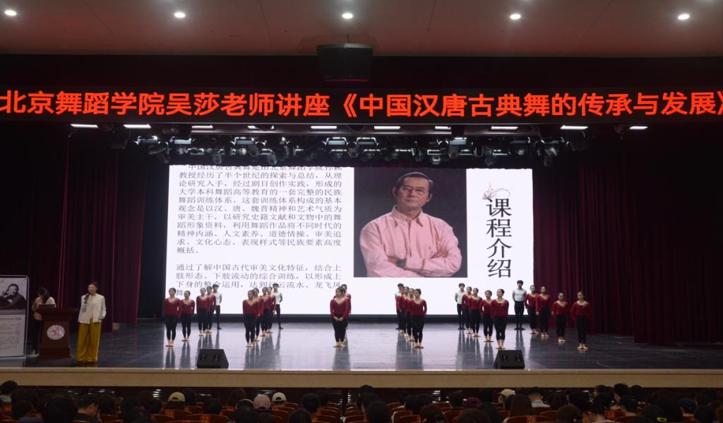本网讯 (音乐舞蹈学院 供稿)10月23日上午,我校音乐舞蹈学院邀请北京舞蹈学院吴莎老师为舞蹈系全体师生作了一场题为《中国汉唐古典舞的传承与发展》的讲座。