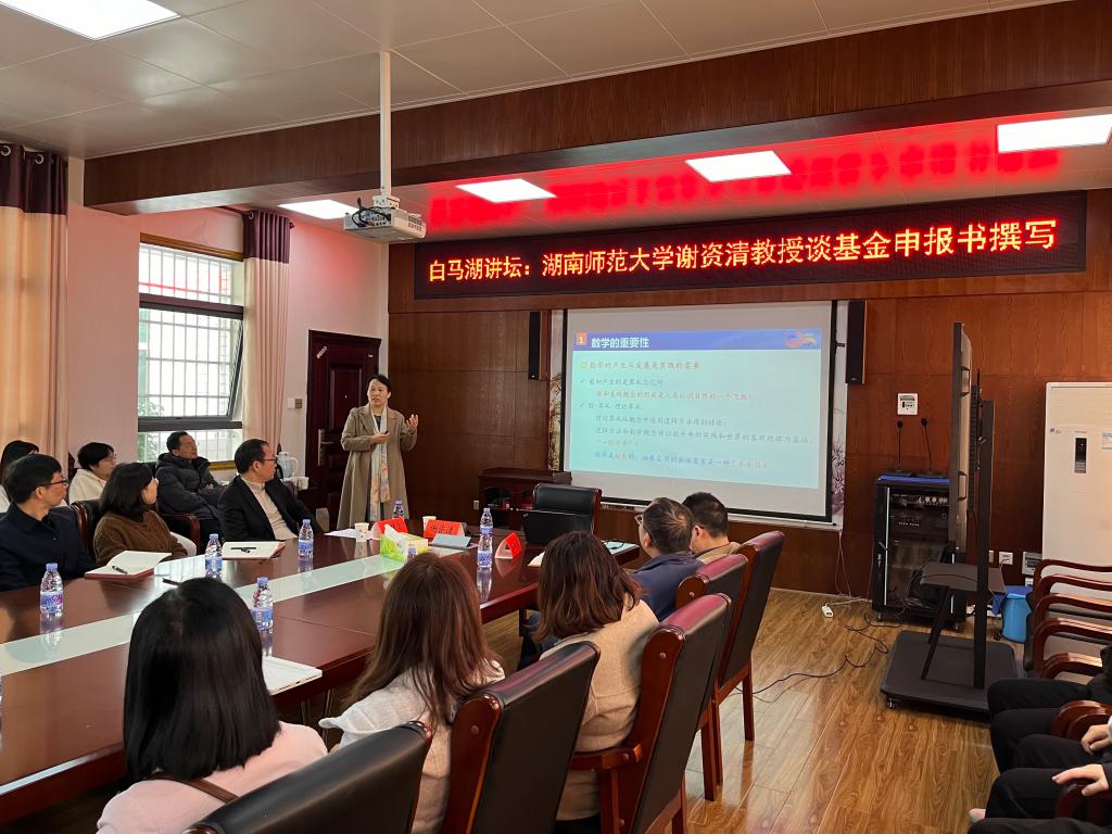 报告会上,谢资清围绕数学的重要性、数学的美、时代的呼唤三个方面,结合国内外科学家故事和自己的成长经历,向在座师生详细阐述了数学的发展史与数学之美。随后,谢资清为在座老师作题为“国家自科基金申请书撰写”的报告,她从立项依据、研究内容、研究目标与关键科学问题、研究方案与可行性分析、研究特色与创新点、年度计划与预期成果等方面进行了详细阐释。