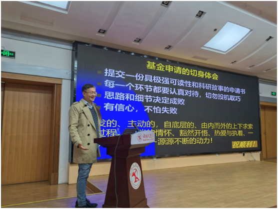 金章东研究员从国家自然科学基金申请的准备工作入手,从“名称摘要”“分类评审”“立项依据”“研究方案”“研究基础”五个方面,系统地阐述了国家自然科学基金项目申报的重点难点和申报要领。此外,金章东研究员详细分享了他在多次函评和会评过程中的感受和经验,指出申报者常出现的简单错误和提升立项可能性的途径。在现场提问环节,现场教师踊跃提问,金章东研究员一一解答了他们的提问。报告会现场氛围轻松愉快,有效拓展了老师们申报项目的视野,坚定了他们的信心。
