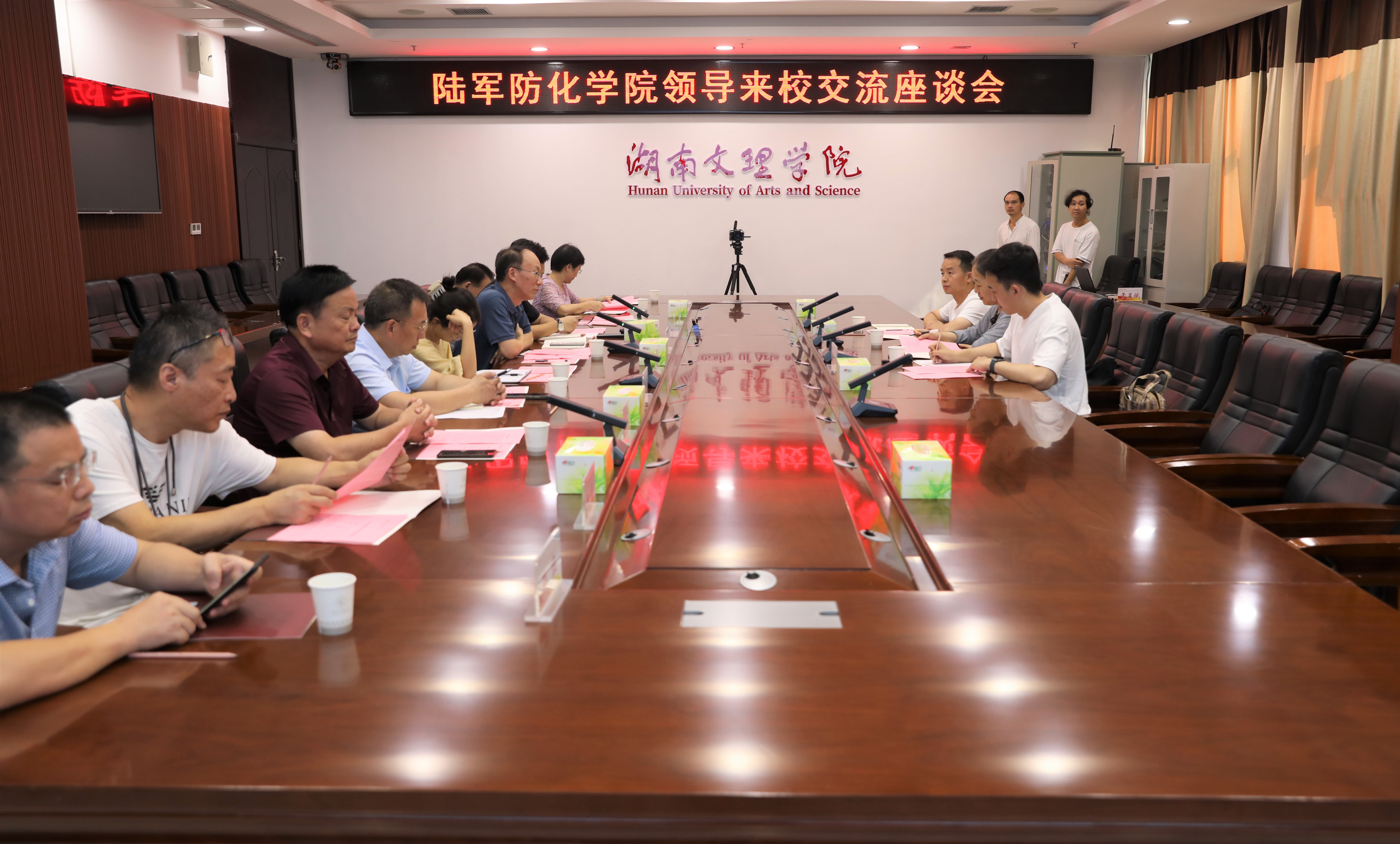 本网讯(文/图 易姣)7月23日,陆军防化学院教授徐莉一行来我校交流,交流座谈会在逸夫楼A305召开。我校党委委员、纪委书记郭文超出席座谈并致辞,学校科技与社会服务处处长李叶林主持座谈会。