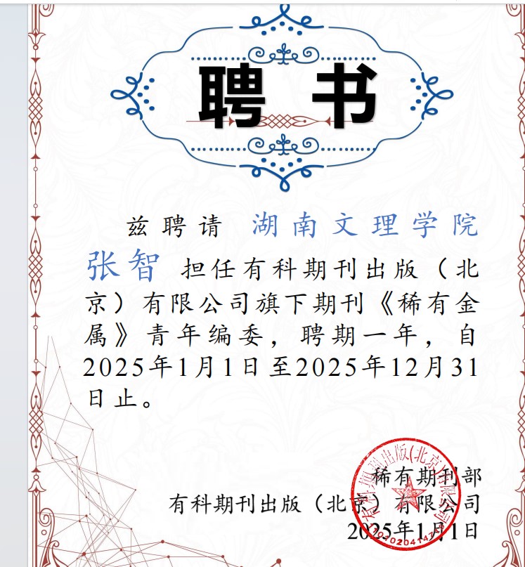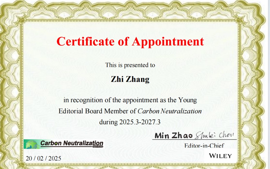 本网讯(化材学院 供稿)近日,化学与材料工程学院张智博士获聘国际学术期刊《Carbon Neutralization》与《稀有金属》青年编委,聘期分别为2年与1年。