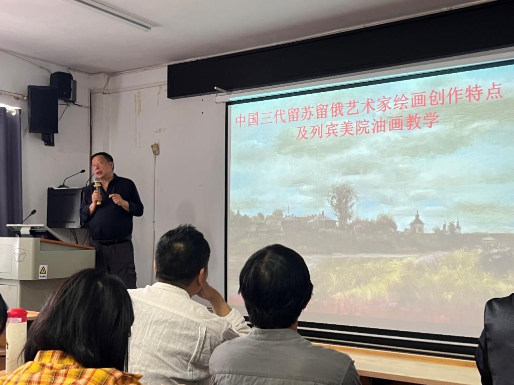讲座中,古棕教授以三代留苏留俄艺术家的艺术实践为脉络,系统梳理了中国油画创作的本土化进程。他指出,这批艺术家在吸收俄罗斯写实主义技法的基础上,将中国传统绘画美学精神融入创作,成功构建了兼具民族文化基因与时代特征的中国油画语言体系。“他们不仅引介了俄罗斯艺术风格,更通过批判性借鉴与创造性转化,突破了东方与西方、传统与现代的二元对立,为中国油画的现代化转型提供了实践范本。”古棕强调,这种艺术探索本质上是一种文化自觉,为外来艺术形式的本土化提供了创新路径。在专题辅导交流中,古棕教授聚焦国家艺术基金项目申报要点,结合历史文化挖掘、社会现象观照等主题创作方向,与学院教师展开深入研讨。