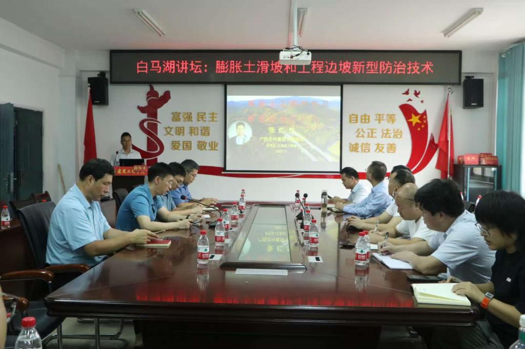 张红日研究员以国家重点研发计划项目《膨胀土滑坡和工程边坡新型防治技术》及省部级科技奖申报为主题作学术报告。报告开篇他紧扣公路建设实际需求,系统梳理了我国膨胀土边坡的分布规律、易引发的灾害类型,并针对性讲解新型处治技术。从材料创新到施工工艺优化,每一个技术要点都结合工程实例,为在场师生和行业代表提供了可落地的技术参考。张红日研究员对2024年获得的广西科技进步一等奖进行了重点阐述,深刻解析了省部级科技奖的申报流程及申报要点。他结合湖南文理学院“应用型办学”定位与土建学院学科优势,提出了一套“量身定制”的校企合作方案,并与在座老师和各单位成员展开了深度探讨。