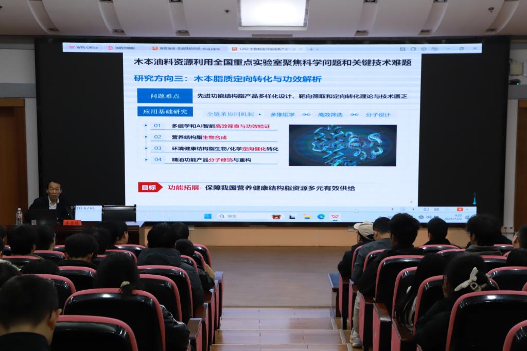 本网讯(文字 陈中元)12月2日上午,湖南省林业科学院科技委主任、木本油料资源利用全国重点实验室执行主任李昌珠研究员应邀来校在图书馆报告厅作学术报告。学校党委委员、副校长覃佐东出席报告会。生命与环境科学学院、合成生物产业学院、医学院等200余名师生参加学术交流活动。报告会由教务处处长兼生命与环境科学学院院长王云主持。