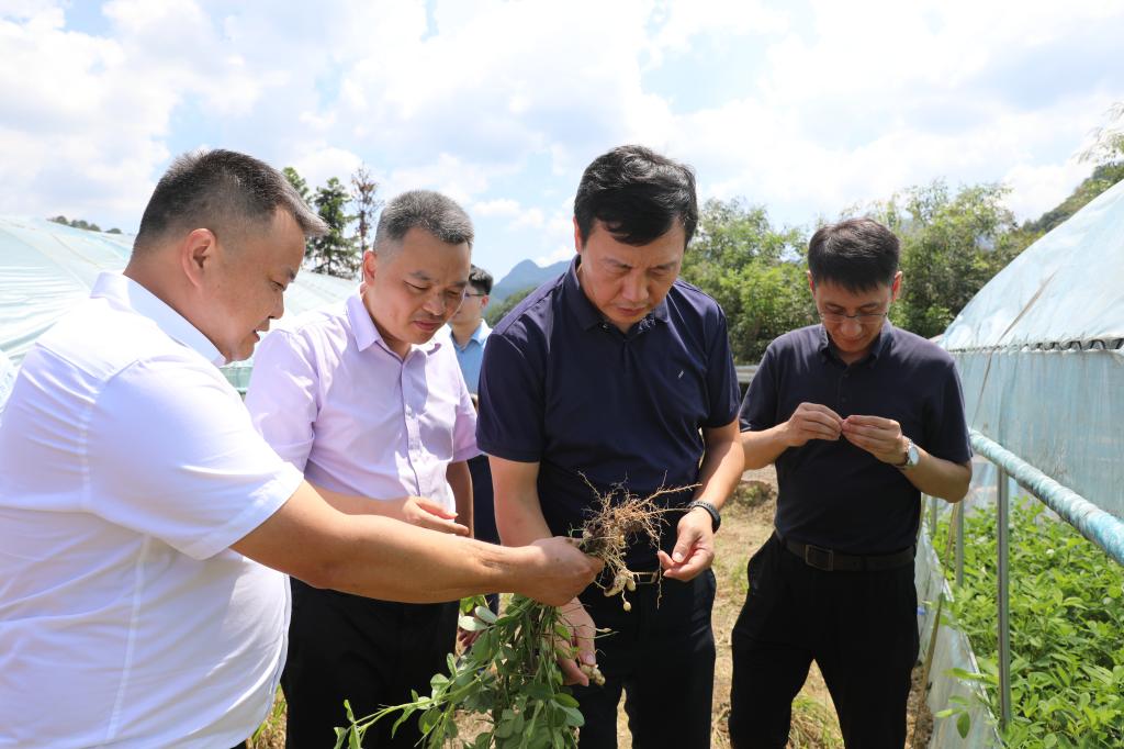 校长刘宇文一行查看大棚花生生长情况